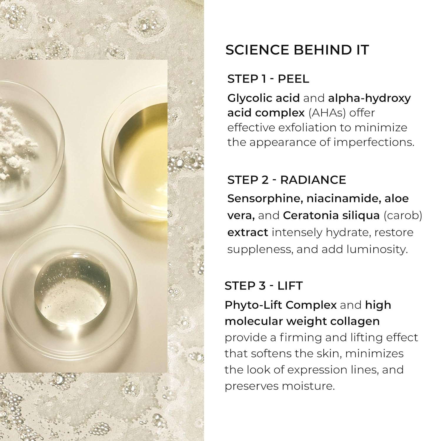 - The second step powerfully hydrates to restore skin comfort, radiance, and suppleness